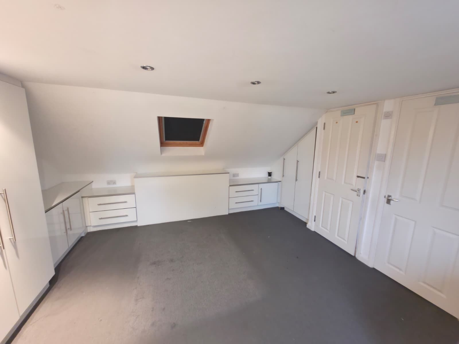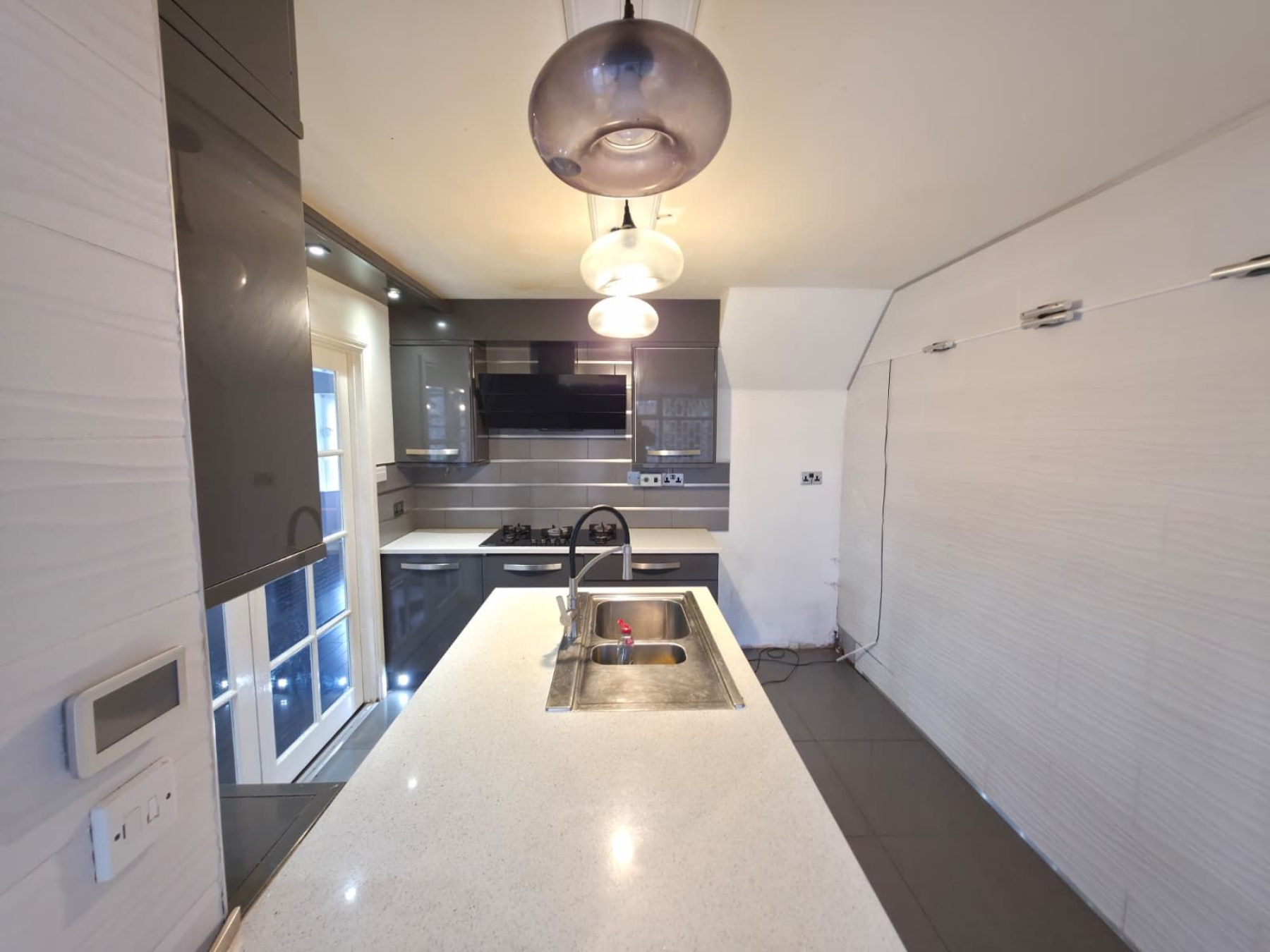 FITTED KITCHEN (3m x 2.8m ): The open-Island kitchen is dream area to cook , featuring high-gloss grey cabinetry, premium quartz worktops, and integrated appliances. Under-cabinet LED lighting adds a touch of sophistication. The layout is complemented by sleek gas hobs, an extractor hood, and a stainless steel double sink, ideal for both meal prep and family gatherings. A set of French doors leads to view of reception and also flooding the space with natural light.