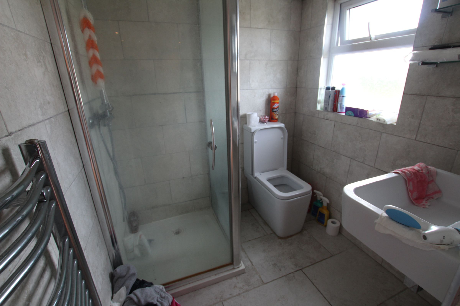 BATHROOM 2: This second floor bathroom has both W/C and Shower area fitted and it is very good in size. Tiles are fitted all over the bathroom and also the wood flooring are in good condition
