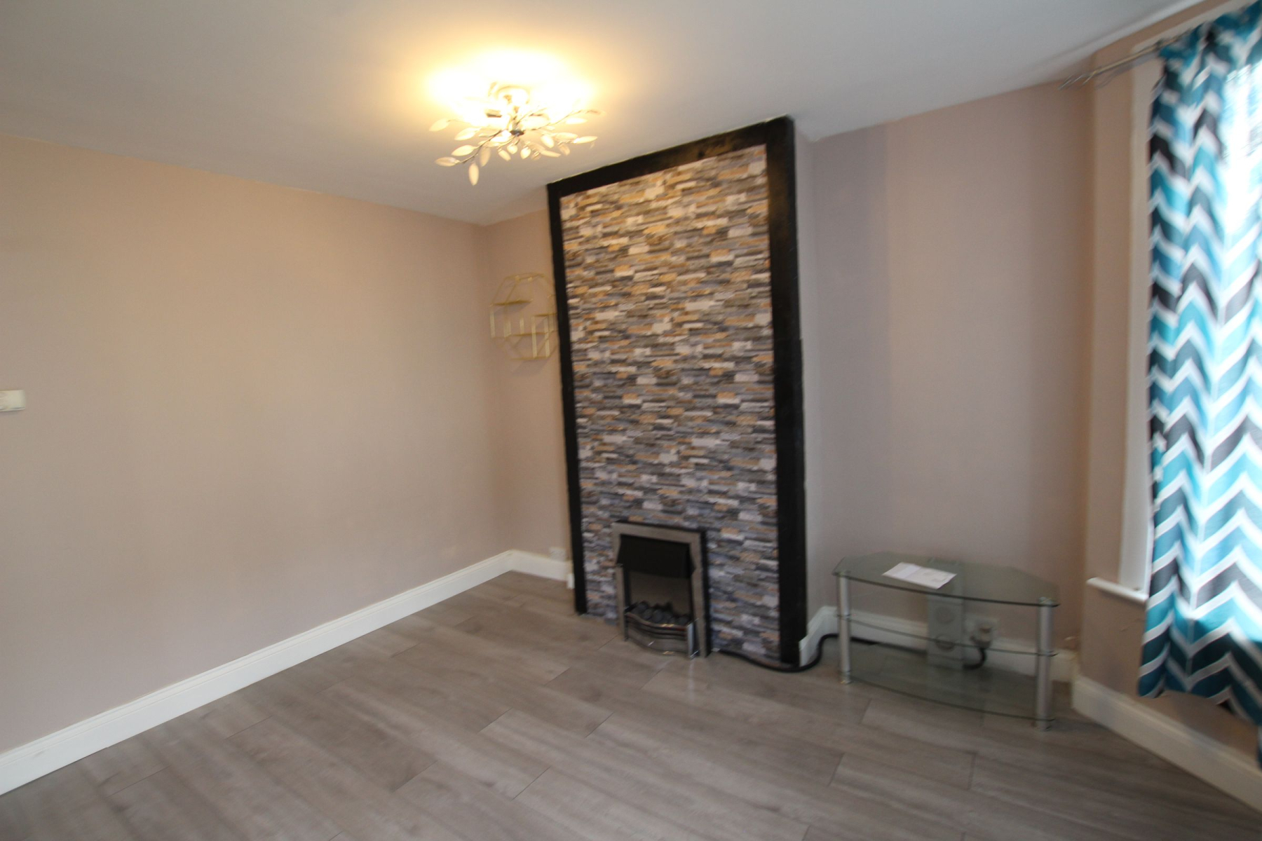 RECEPTION : The large, airy reception room boosts a stunning feature wall with cream coloured wall and brick wallpaper pattern in the middle around the chimney. With ample space for living and dining areas, the room exudes warmth with its light laminated flooring, offering both comfort and style.